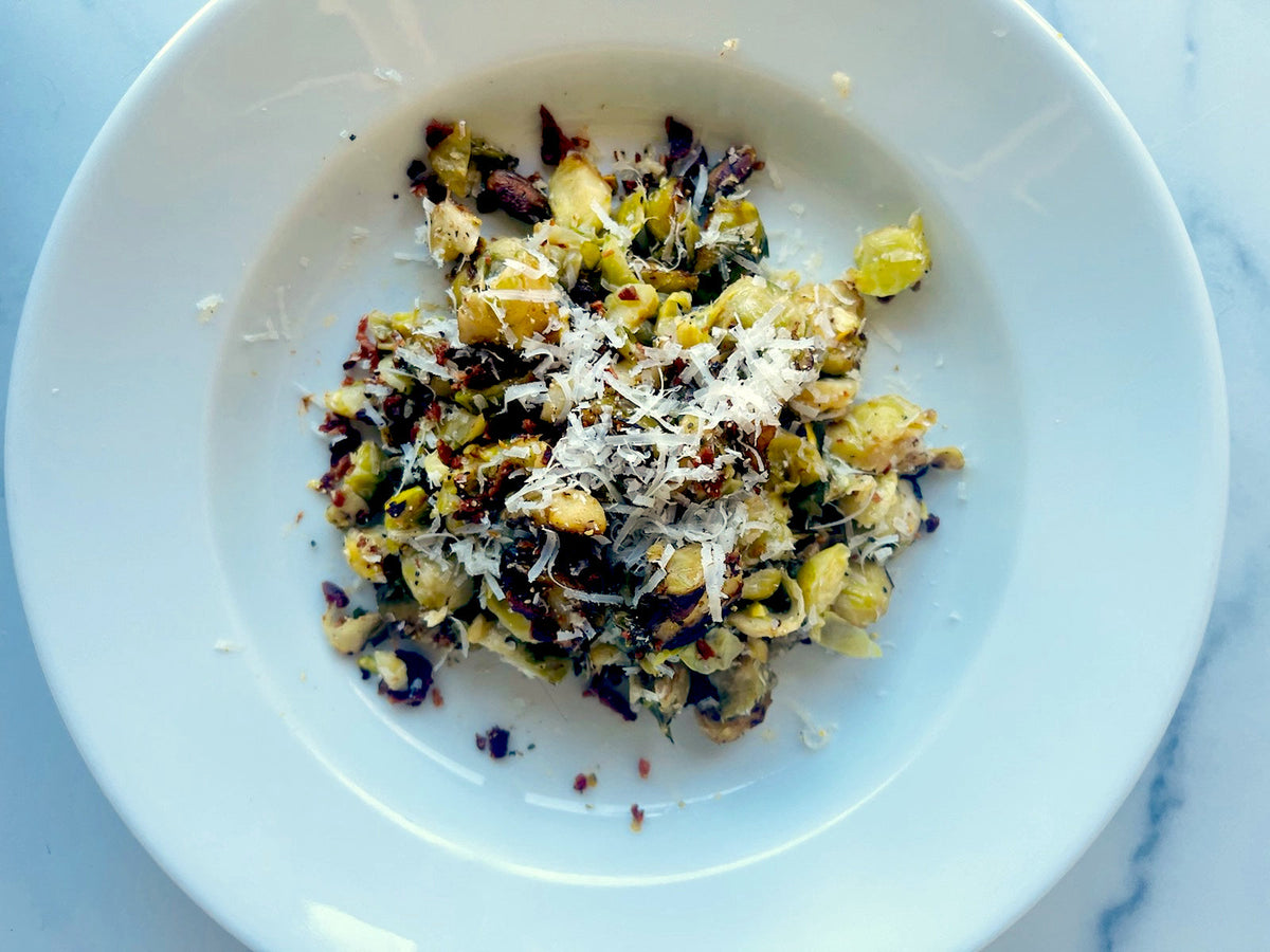 Place the brussels sprouts on a baking sheet. Lightly drizzle with Arbequina evoo, Maple Balsamic, and a few sprinkles of the Garlic Maple Pepper. Gently toss to combine. Cook in the oven for about 15 minutes or desired doneness. A family favorite of mine is placing the brussels sprouts under the broiler for 10-15 minutes. We like them a little crispy.