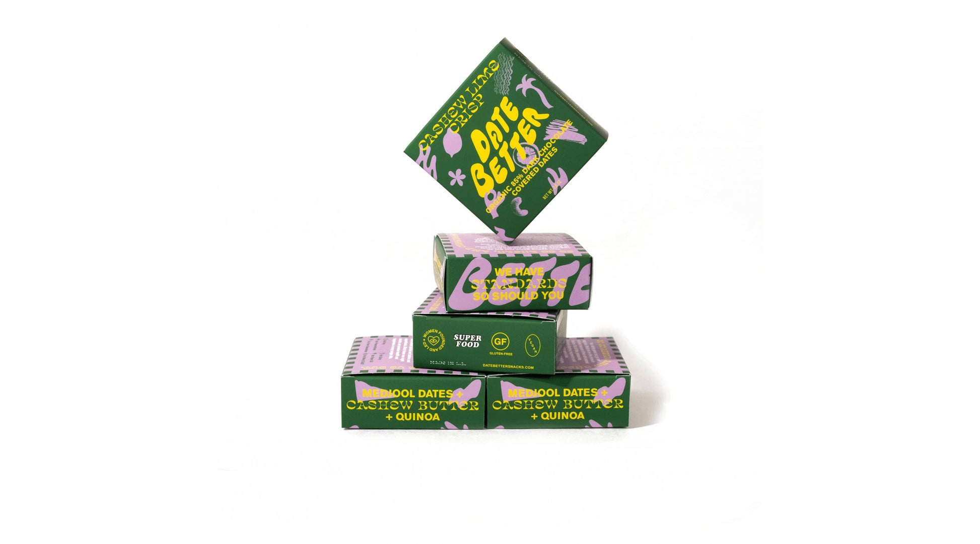 Bright, bold, and a little bit unexpected, Cashew Lime Crunch brings major vacation energy to your snack aisle. Creamy cashew butter infused with zesty lime and toasted quinoa is tucked inside soft Medjool dates, dipped in 85% dark chocolate. It’s tart, rich, and totally addictive.