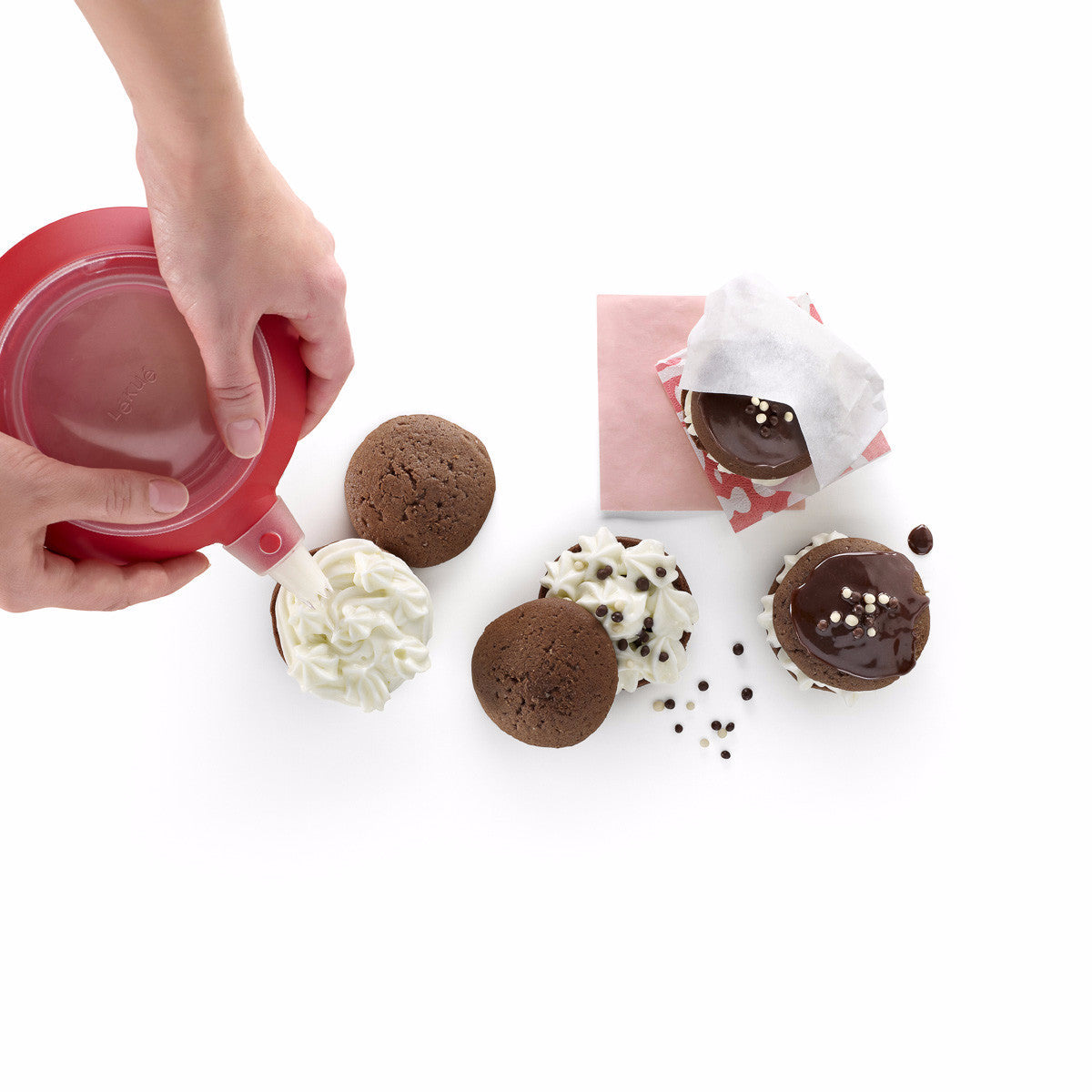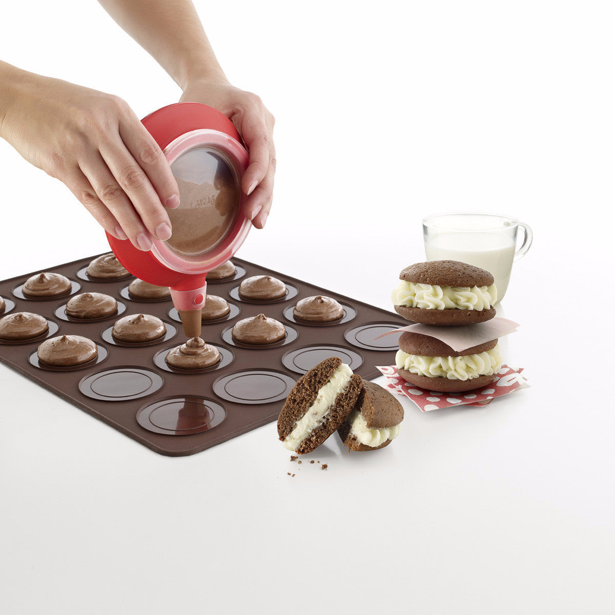 Kit for making whoopie pies consisting of a Decomax, a whoopie baking sheet and a recipe booklet. Whoopie pies could be considered as a cookie or as a cake and are a dessert that consists of two cake-like cookies sandwiching a creamy, frosting-like filling. The traditional whoopie might be chocolate cake with a cream filling, but whoopie pies are now available in many different flavors with a whole variety of fillings. They are easy to make at home, and although there are special pans out there to help you shape your cake rounds, they require no special equipment.